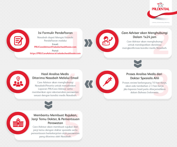 Setelah Nasabah memenuhi syarat untuk layanan ini dan pendaftaran selesai, Care Advisor kemudian akan menghubungi Nasabah melalui telepon atau email dan memberikan panduan penggunaan layanan PRUCare Advisor di setiap langkah perjalanan medis Nasabah.