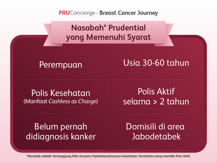 Nasabah Wanita existing Prudential Indonesia berusia 30-60 tahun pada saat pendaftaran skrining kanker payudara atau diagnosa pertama kali atas kanker payudara, yang memiliki polis aktif manfaat cashless untuk produk Kesehatan yang bersifat as-charged dengan plan apapun (PRUPrime Healthcare, PRUPrime Healthcare Syariah, PRUPrime Healthcare Plus, PRUPrime Healthcare Plus Syariah, PRUPrime Healthcare Plus Pro, PRUPrime Healthcare Plus Pro Syariah, PRUSolusi Sehat, PRUSolusi Sehat Syariah, PRUSolusi Sehat Plus Pro, PRUSolusi Sehat Plus Pro Syariah, PRUWell Health, PRUWell Health Syariah, PRUWell Medical, dan PRUWell Medical Syariah), telah melewati masa tunggu (waiting period) 24 bulan sejak tanggal penerbitan polis atau sejak perubahan manfaat polis terakhir, atau sejak pemulihan polis terakhir dan tidak memiliki riwayat klaim atau perawatan terkait kondisi kanker, serta berdomisili di wilayah Jabodetabek.
